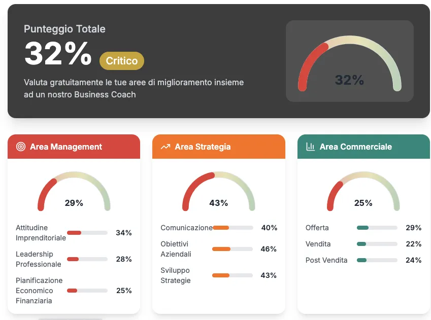 Il CheckUp è stato utilizzato con successo in 23+ settori diversi: manifatturiero, servizi, retail, e-commerce, consulenza, healthcare, hospitality e molti altri. Le domande si concentrano sui fondamentali del business (management, strategia, commerciale) che sono universali per qualsiasi azienda con fatturato da €100K in su.